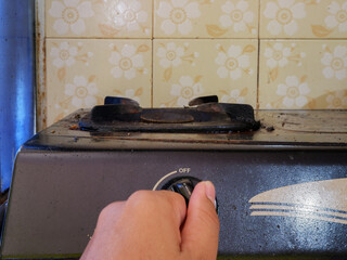 A person’s hand turning on a dirty gas stove knob in a kitchen, showing daily cooking activity, home appliance use, and need for cleaning or maintenance. Suitable for household concept.