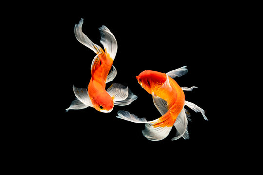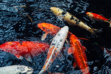 Fancy Koi fish or Fancy Carp swimming in a black pond fish pond. Popular pets for relaxation and feng shui meaning.