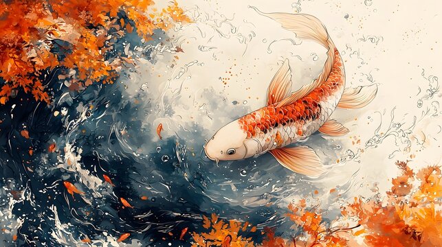 A vibrant carp leaping from the water in a dynamic Asian inspired scene