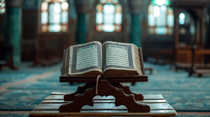 Portrait of al quran on the folding table in the mosque. Holy book for muslim worship. Generative AI