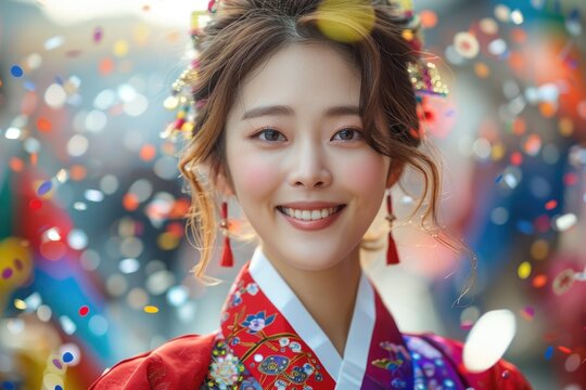 Joyful woman in traditional Korean hanbok dancing with vibrant energy surrounded by colorful decorations and smiling faces celebrating cultural heritage and unity. Korea Independence Day