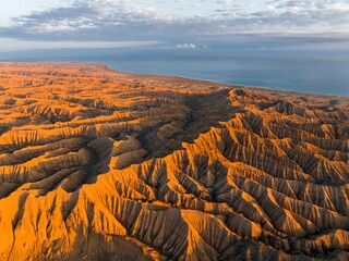 Landscape of eroded hills at Lake Issyk Kul, Badlands at sunrise, aerial view, Canyon of the Forgotten Rivers, Issyk Kul, Kyrgyzstan, Asia