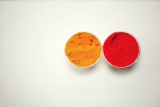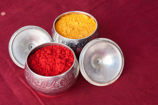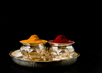 India's tradition Turmeric (Haldi) powder and kumkum powder in silver bowl for pooja.