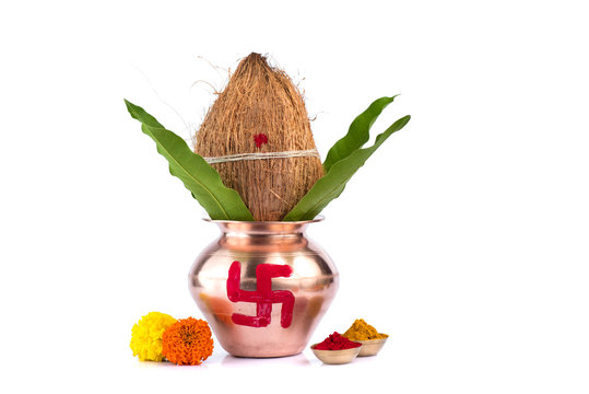 Copper Kalash with coconut, mango leaf, Haldi, kumkum and sweets with marigold flower decoration on a white background. Essential in Hindu puja.