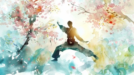 Watercolor painting of kung fu master. Beautiful watercolor painting of a Kung Fu master practicing martial arts in a serene natural setting with blossoming trees.