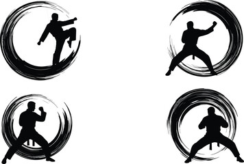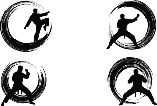 Martial arts fighter silhouettes in brush circle style performing karate and kung fu poses, vector illustration for combat sports design.