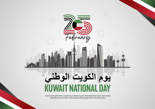 64 years anniversary of Kuwait national day 25 February 2025 illustration with Kuwait skyline. The script in Arabic means: National day, Kuwait. Anniversary Celebration Card 25 February.