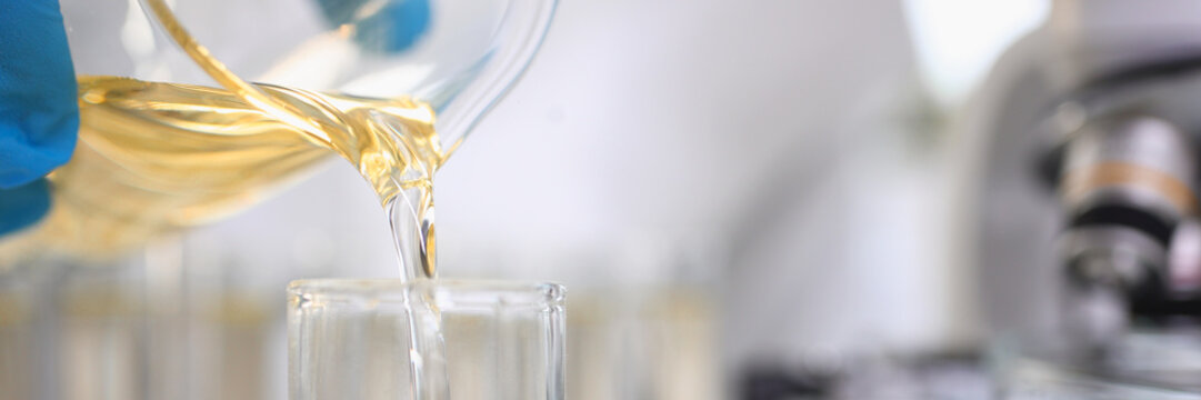 Close-up hands holding pouring blue fluid liquid beaker flask test tube glassware sample laboratory for compare in medicine chemical biology medical medicine science experiment technology analysis