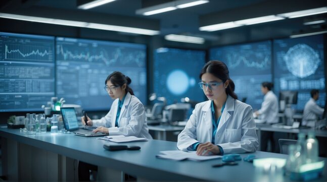 A team of laboratory technicians conduct a series of tests on a chemical analyzer in a biological laboratory. Two female scientists work in a modern equipped computer laboratory