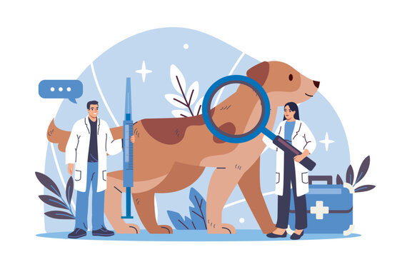 Two veterinarians in lab coats examining a large cartoon dog with a magnifying glass and a syringe on a blue abstract background. Concept of pet healthcare. Vector illustration