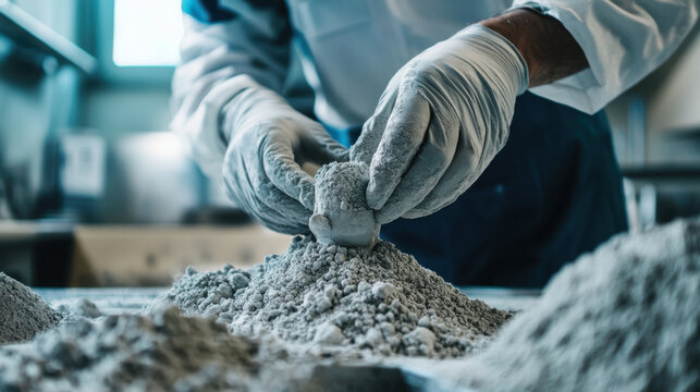 Cement technician testing samples in lab, focusing on material quality and precision. hands carefully handle cement powder, showcasing importance of accuracy in construction materials