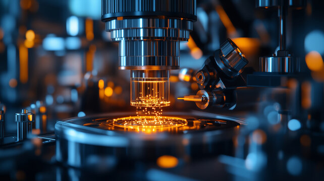 Close-up view of a sophisticated gene sequencing machine surrounded by sterile lab equipment, illuminated by soft lighting that enhances its intricate design