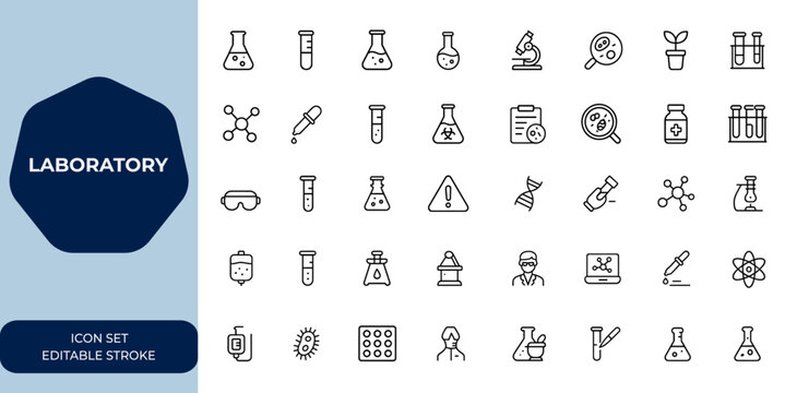 laboratory icon set with editable strokes. Linear vector illustration collection for lab, science, research, medical, test, chemistry, analysis, equipment, experiment, vector and more.