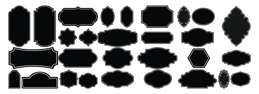 Black decorative label silhouettes, vintage frame shapes, retro outline badge, ornate geometric borders, empty tag design graphics, shield elegant royal crest emblem, retro sticker. Vector set
