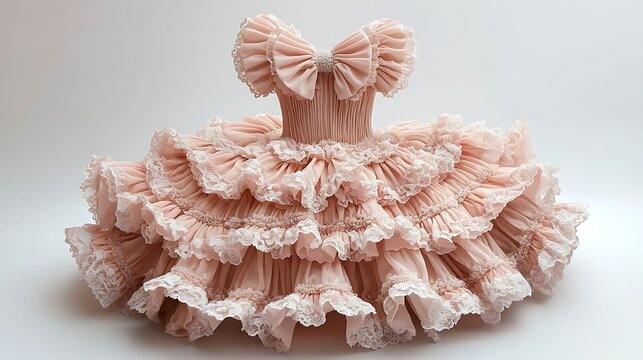 A pink ruffled dress with lace trim and a bow creates a sweet and charming look.