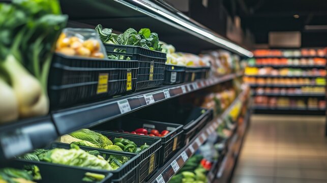 Grocery store shelf in a food desert shows lack of healthy food options and empty produce section