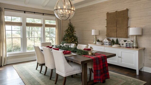Minimalist Christmas dining room with rectangular glossy lacquer table and elegant holiday styling for Pacific Northwest homes