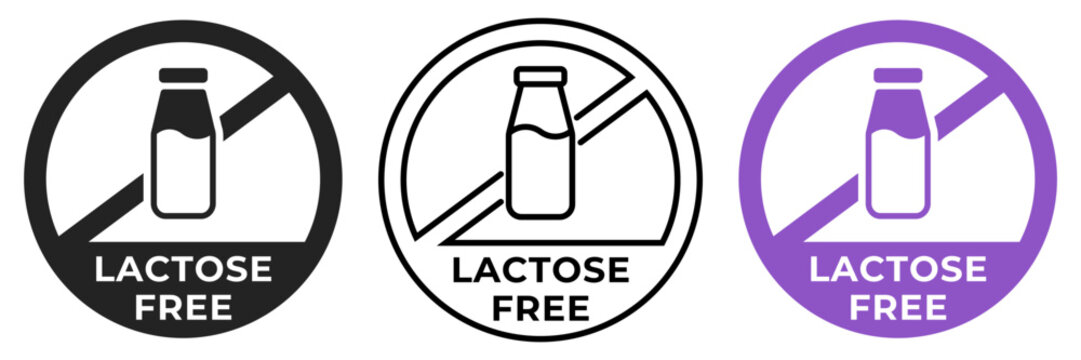 Lactose free icon. No lactose forbidden label. Dairy free ban or prohibition logo, illustration, badge, symbol, stamp, sticker, emblem or seal isolated.