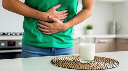 Man clutching his stomach in pain after drinking milk, possibly lactose intolerant, in a kitchen setting