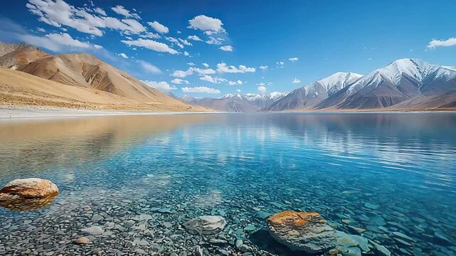 Reflection of Mountains on Pangong Lake with blue sky background. Leh, Ladakh, India.