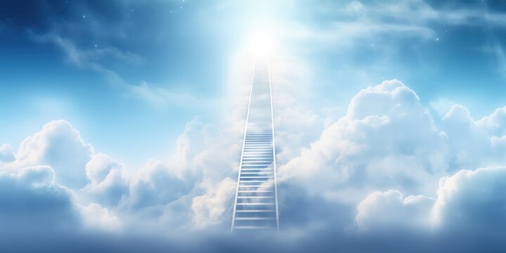 A golden ladder is rising into the sky, surrounded by clouds and shining sunlight. The scene includes an endless horizon of light blue sky with white fluffy clouds.