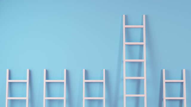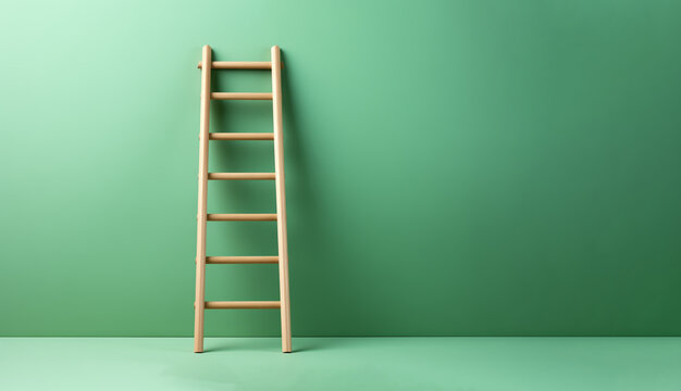 A wooden ladder against a light green color wall with a copy space background. Achieving goals and ladder to success concept