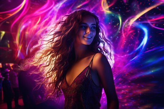 Photo of carefree lady friendship have corporate festival buddies on neon modern disco with flying confetti hands up