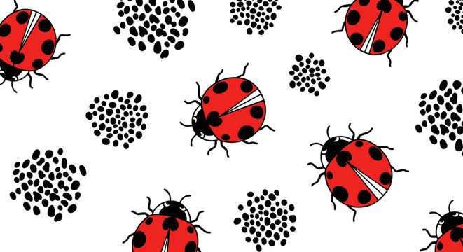 Seamless black and white pattern with cute, hand-drawn ladybugs scattered on a white background, perfect for a coloring page.