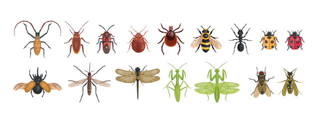 A charming seamless pattern of various colorful insects and leaves, illustrated in a flat, modern graphic style.