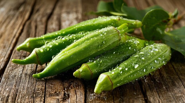 fresh green ladyfinger vegetables glistening with morning dew on a rustic wooden table