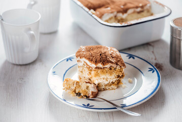 Tiramisu on a white plate. Italian dessert made of ladyfingers dipped in coffee and layred with cream made of eggs and mascarpone cheese, powdered with cocoa.