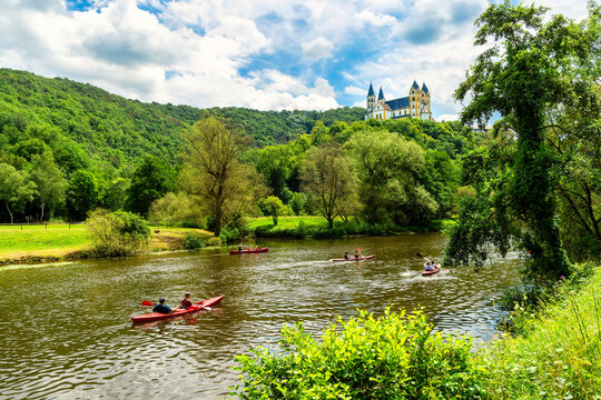 Obernhof at the Lahn with Kloster Arnstein on the hill . Beautyful landscape with river and boats in the Lahn valley on a sunny day in summer.