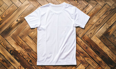 White t-shirt mockup laid flat on a parquet wood floor, with intricate patterns and textures, ideal for stylish and upscale branding.