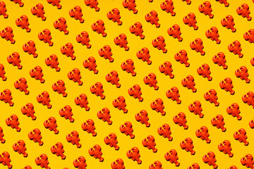 Pattern of rows of plastic lobsters flat laid against yellow background