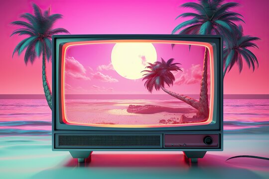 A text-filled monitor radiates in the evening light, reflecting off the serene ocean and swaying palm trees of a distant beach