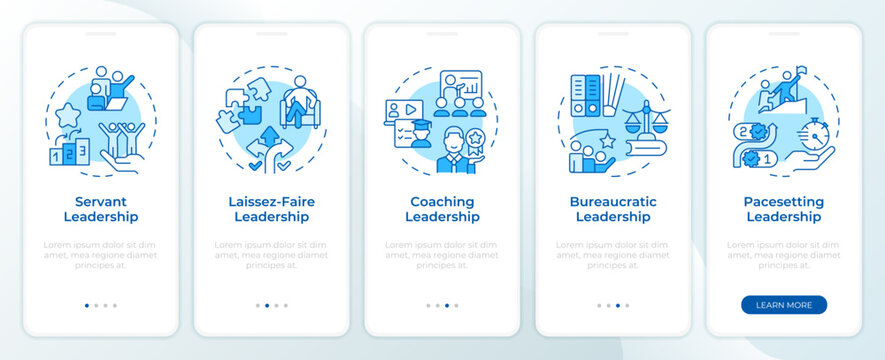 Styles of leadership management blue onboarding mobile app screen. Walkthrough 5 steps editable graphic instructions with linear concepts. UI, UX, GUI template. Montserrat SemiBold, Regular fonts used