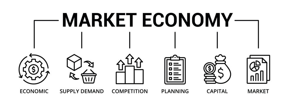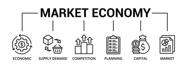 Market economy banner icon with economic, supply demand, competition, planning, capital, market