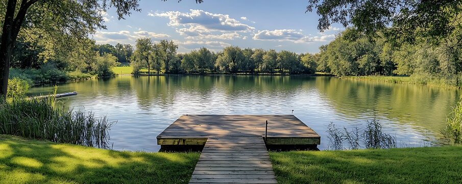 lakefront house with a white porch and gray walls, green grass near the deck and a small dock on the side, view from the backyard showing the water with calm waves Generative AI