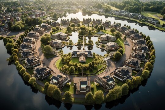 A peaceful lakeside view with a dock and the soft golden light of sunset creating a tranquil atmosphere. Lakeshadow. Illustration