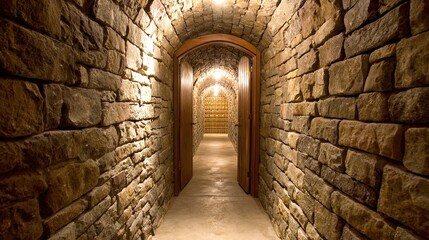 spinor. A narrow stone corridor leading to a vaulted storage room with soft interior light. real-estate listings.