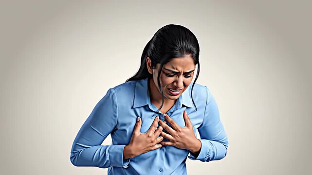 Expressing Heartfelt Pain and Discomfort with Emotional Woman in Blue Shirt on Neutral Background
