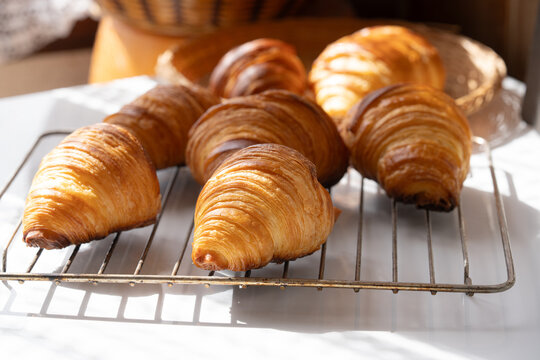 A cooked golden color of traditional French croissants in a baking tray. It's viennoiserie of Austrian origin. Made with a yeast leavened dough that has been laminated with butter in multiple layers.
