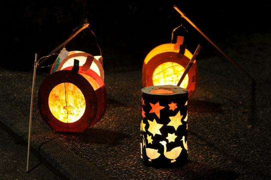 un groupe d'enfants avec des lampions la nuit pour le solstice d'été