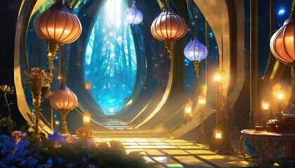 Row of round paper lanterns in a home garden on a wooden thatched background at night. Festive decoration in the garden on an evening.