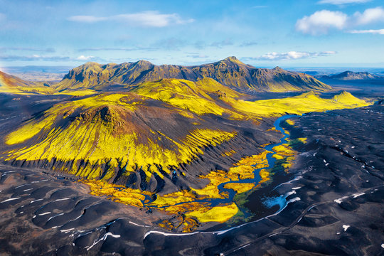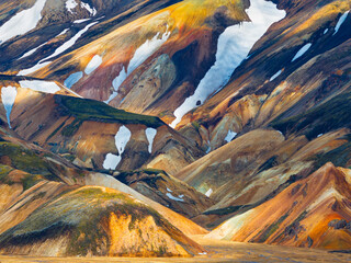 Aerial view by drone of awesome mountain in Landmannalaugar area, Iceland, Polar Regions