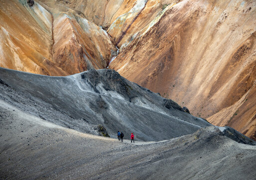 Landmannalaugar, Iceland - July 30, 2017: Hikers in volcanic mountains of Landmannalaugar in Fjallabak Nature Reserve. Iceland