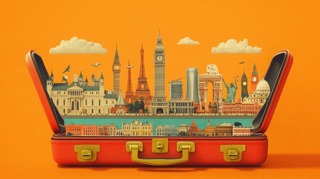 Open suitcase overflowing with iconic landmarks from around the world.  A vibrant collage of travel dreams.