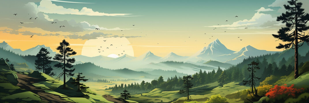 wide panoramic landscape Illustration scenery drawing with morning sunrise with colorful cool bluish effect and clouds awith bright sky through foggy greeny mountain range