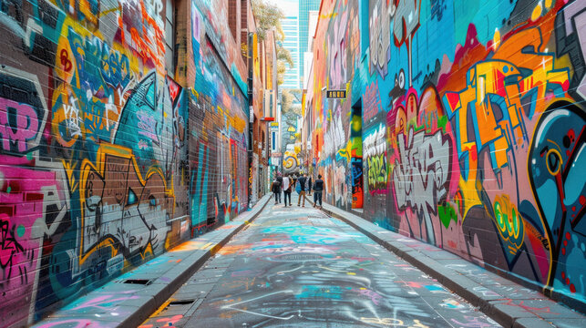 Vibrant night cityscape with colorful graffiti art on urban alley walls, illuminated by neon lights of downtown skyline.