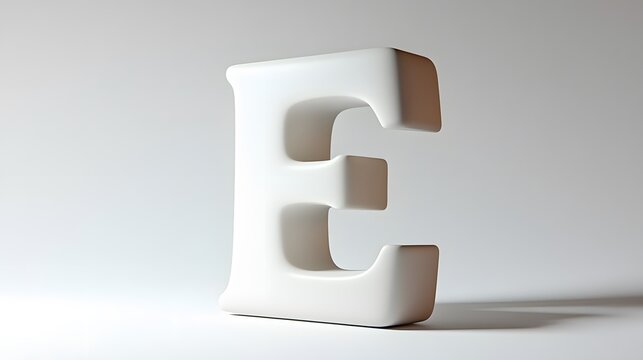 Letter E in 3D: A single, clean 3D-rendered letter E, sculpted in a smooth, elegant design. The letter casts a soft shadow